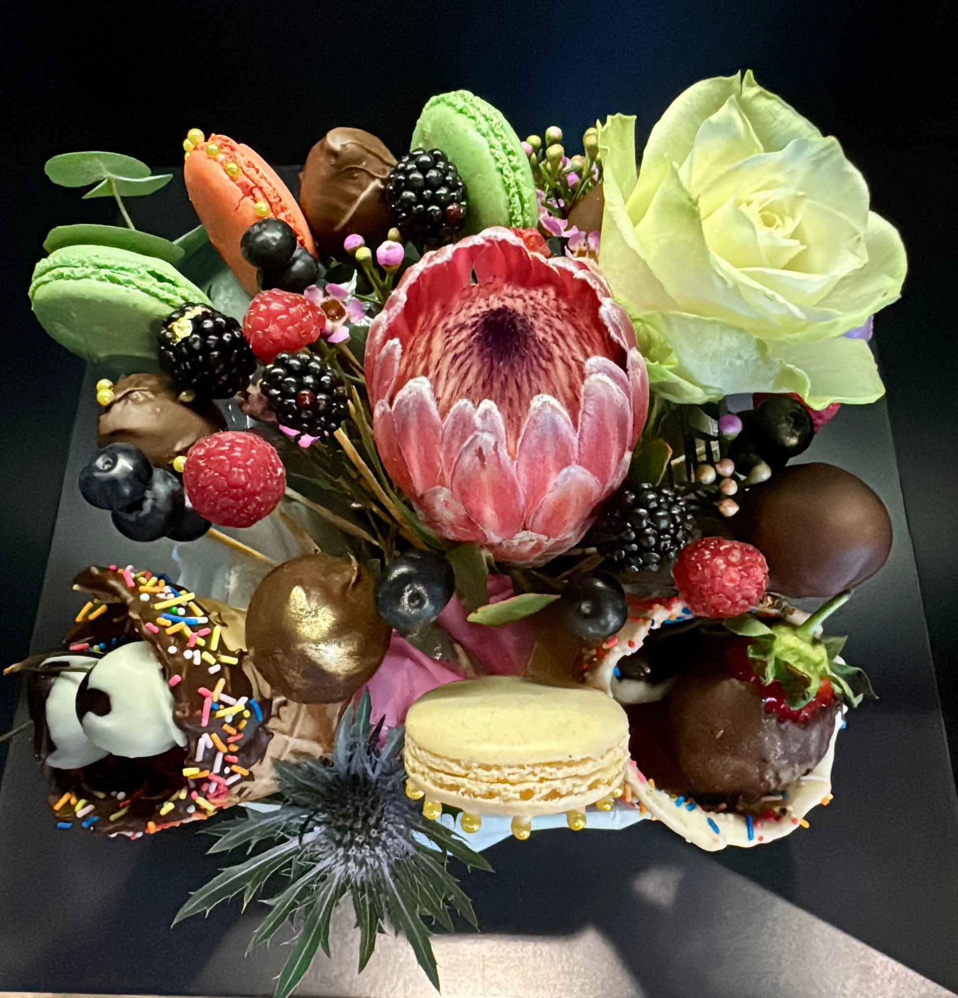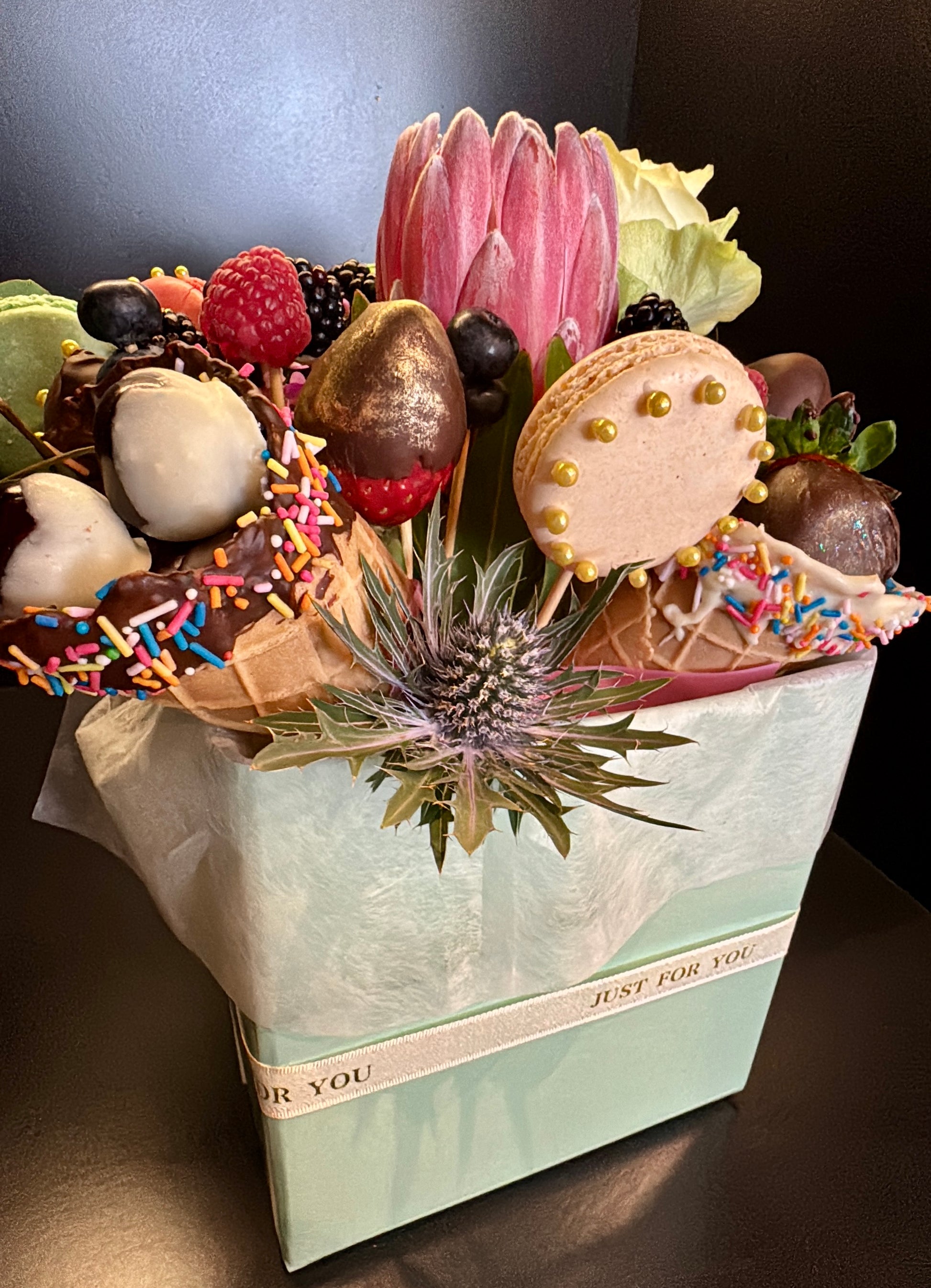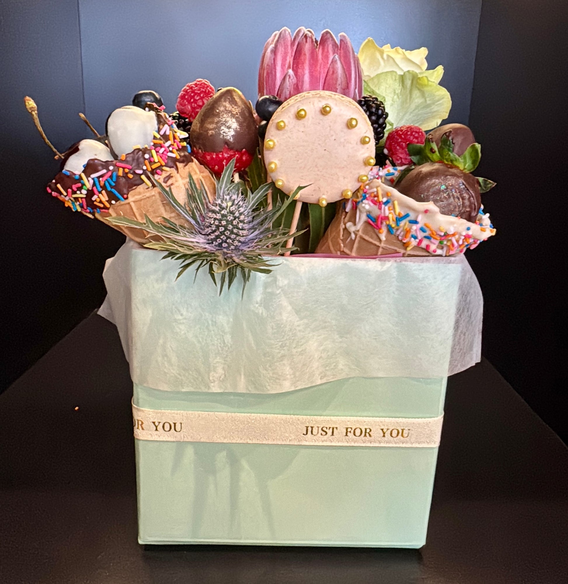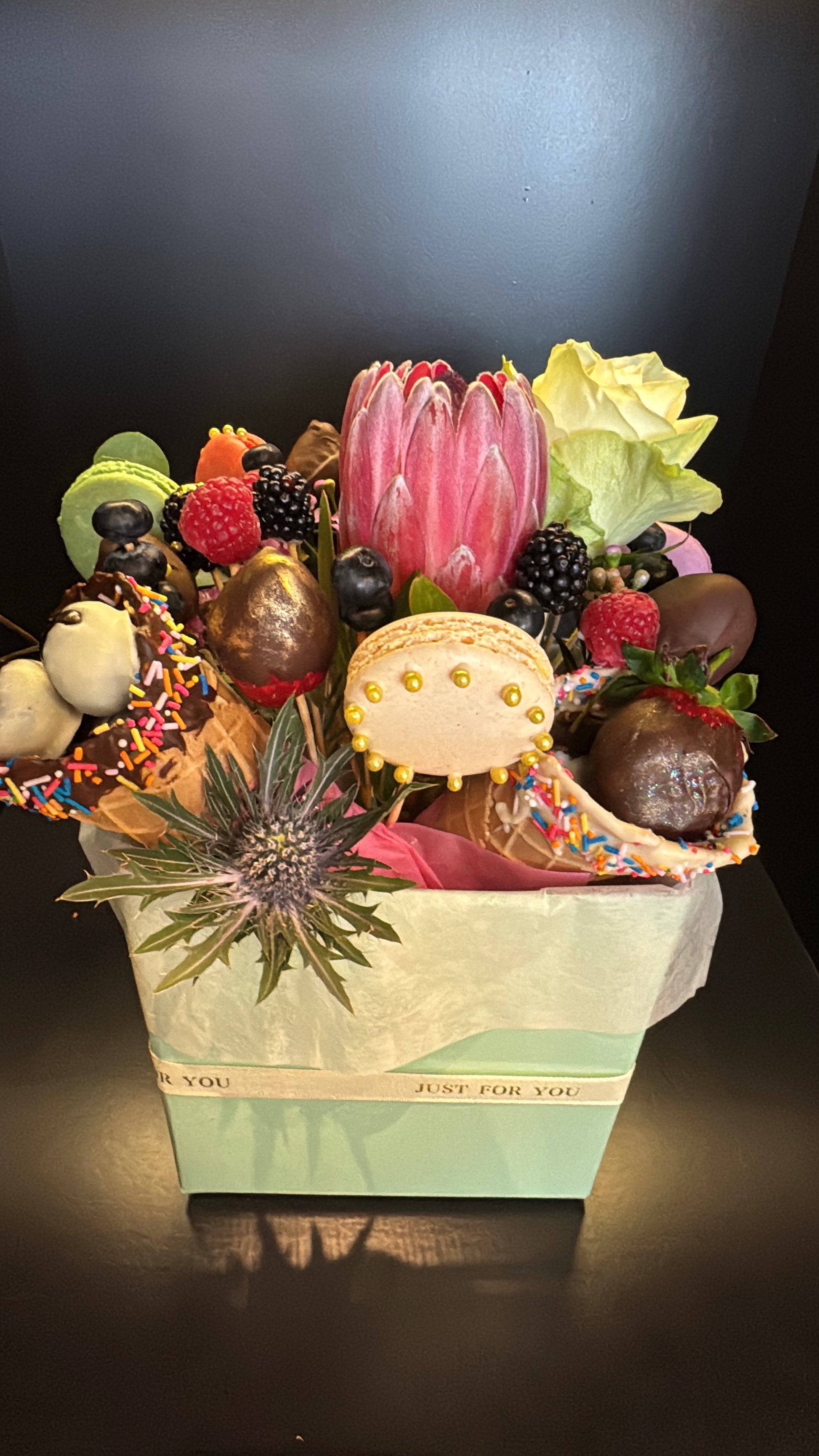 The Blue berry & bloom box includes succulent blueberries, raspberries, chocolate-covered strawberries and cherries, paired with two sugar cones and delicate macarons, beautifully accented with select fynbos and blooms for a refined finish.