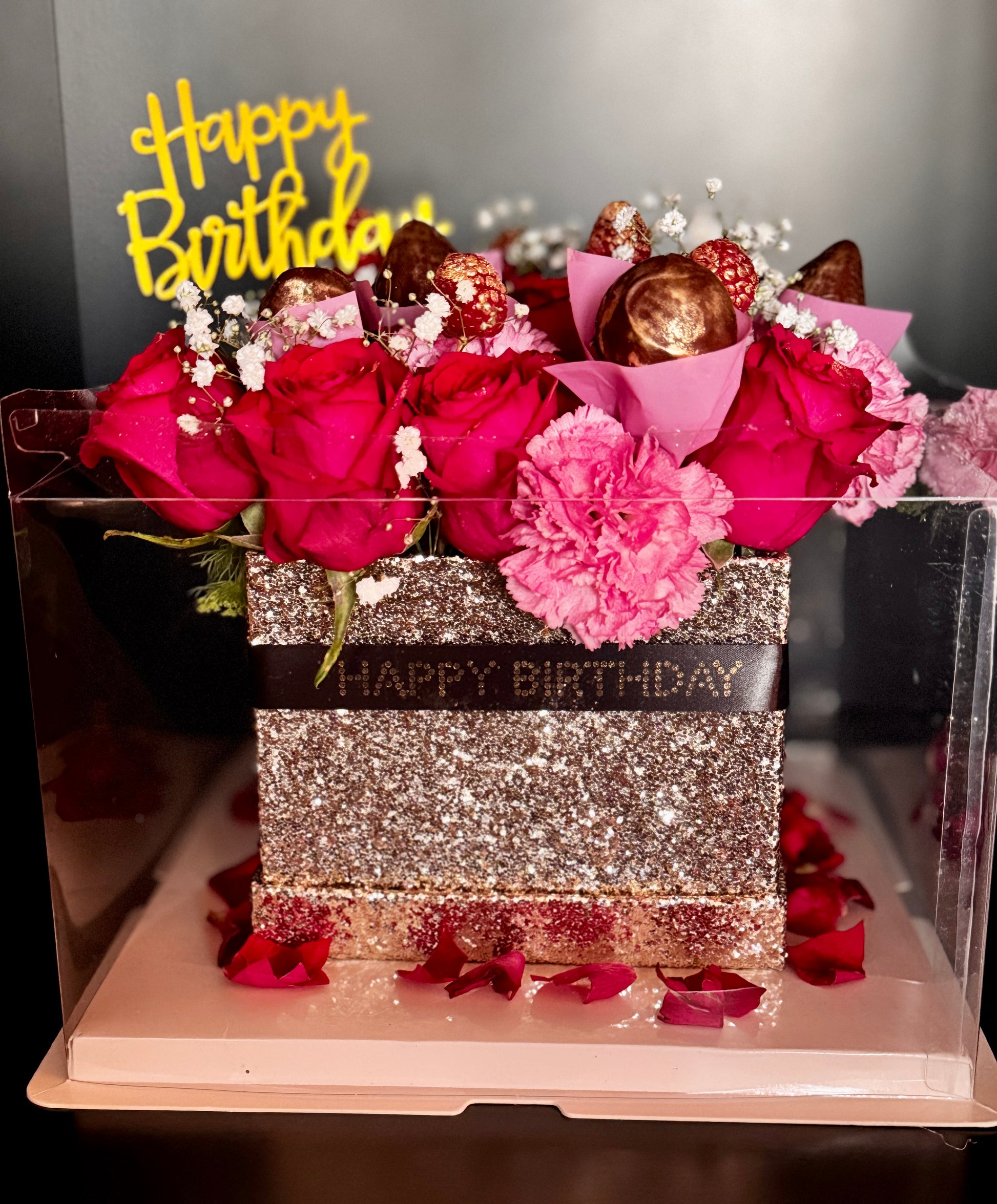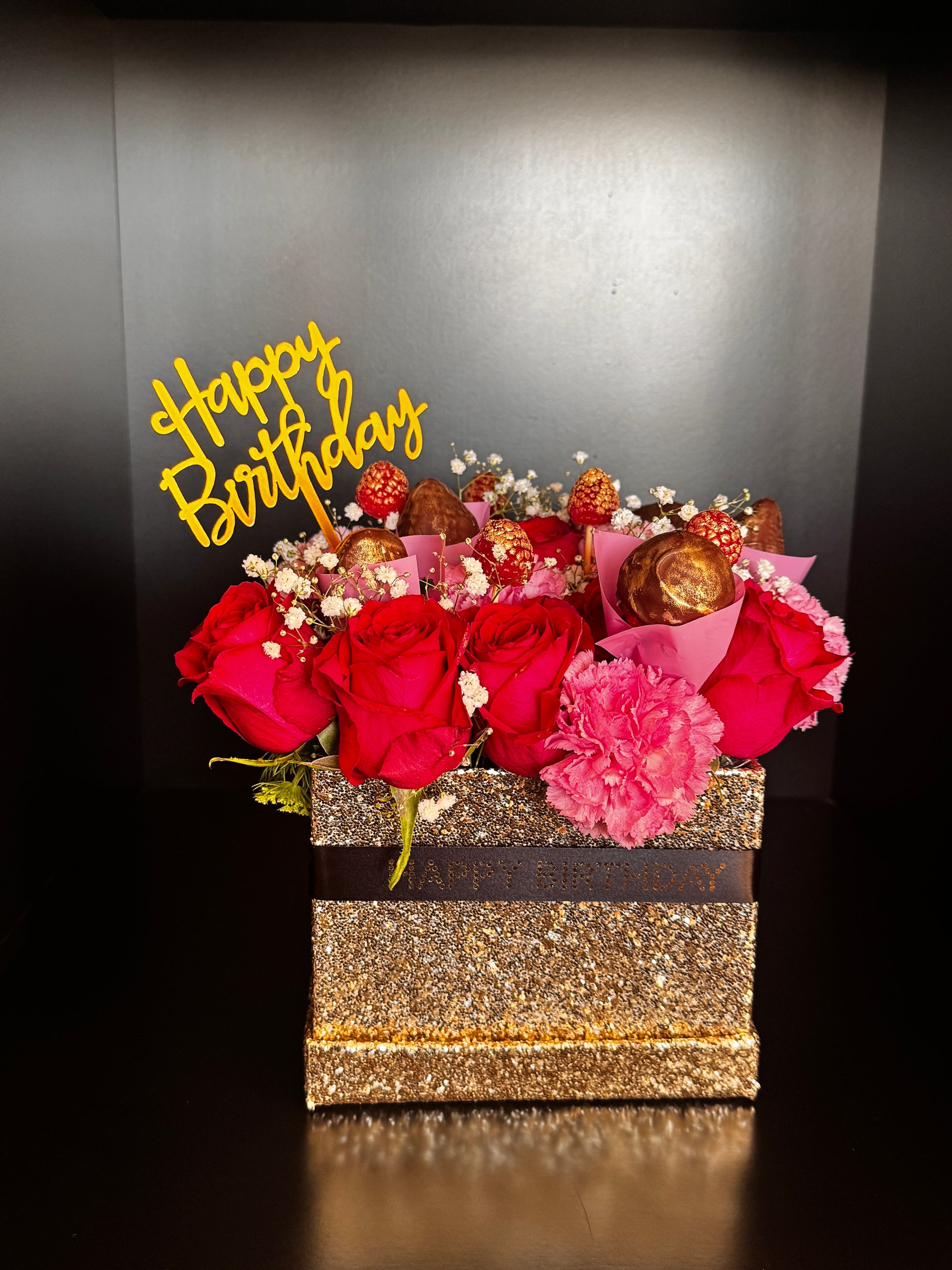The Sparkle Berry & Bloom box is beautifully arranged with chocolate-covered strawberries, fresh strawberries, raspberries, and elegant roses and blooms, all presented in a sleek square transparent box for a polished and sophisticated look.